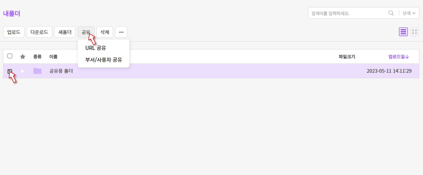 폴더 옆 부서/사용자공유 버튼이 생성된 모습을 확인할 수 있습니다.