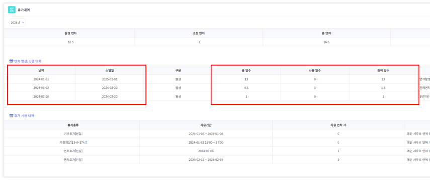 (1) [연차 발생/소멸 이력]에서 나의 휴가가 발생될 때 휴가에 대한 발생 날짜와 소멸일, 해당 휴가에 대한 총 일수, 사용 일수, 잔여 일수를 확인할 수 있습니다. 이전에는 발생 개수만 표기되어 해당 연차의 상세한 정보를 알기가 어려웠는데요. 추가된 내용을 총해 연차가 발생되고 소멸되는 시점과, 해당 시점에서의 연차개수를 확인하실 수 있게 되었습니다.