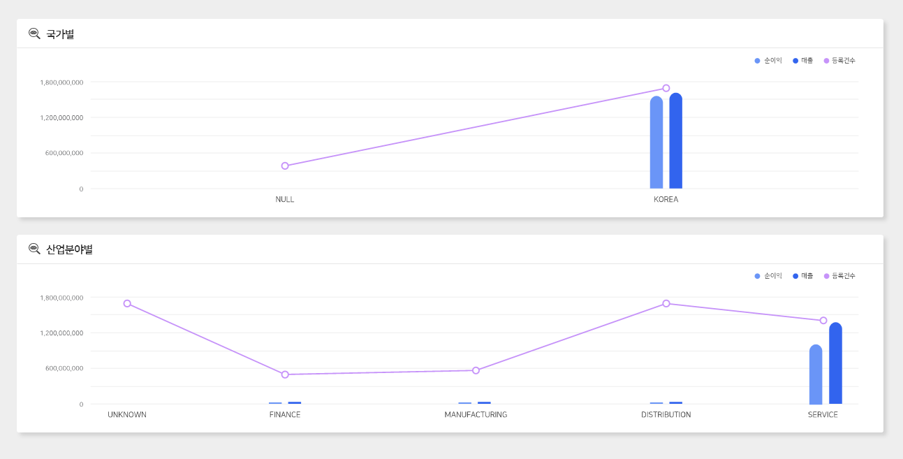 검색 필터의 ‘더보기’ 항목에서 국가별, 산업분야별 조건을 선택한 경우 조회되는 화면입니다.