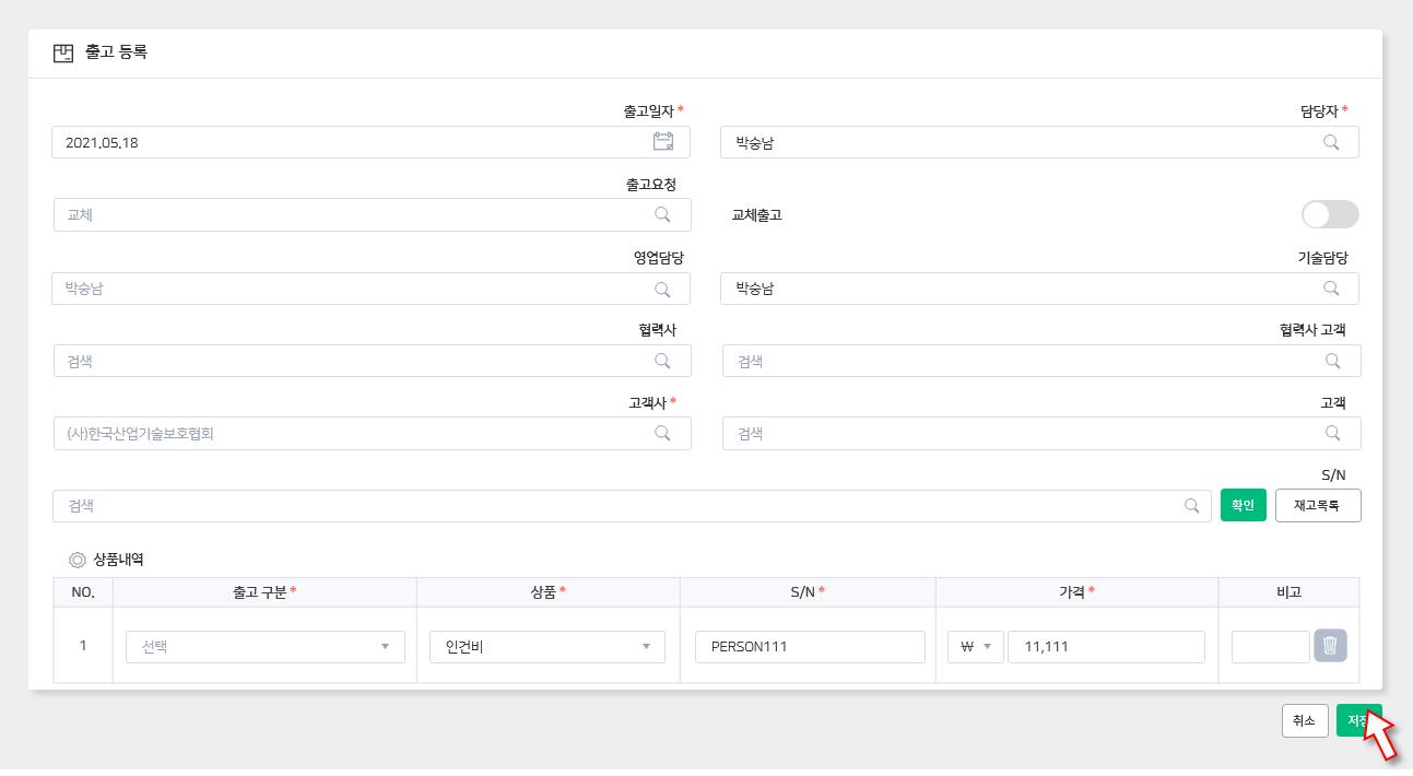 ② 요청건에 대한 출고 제품이 자동으로 입력됩니다.